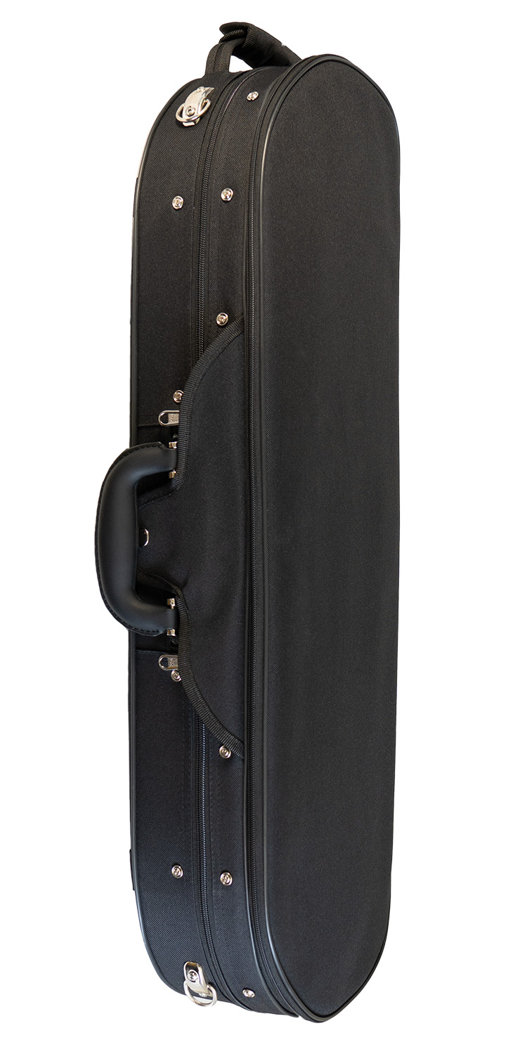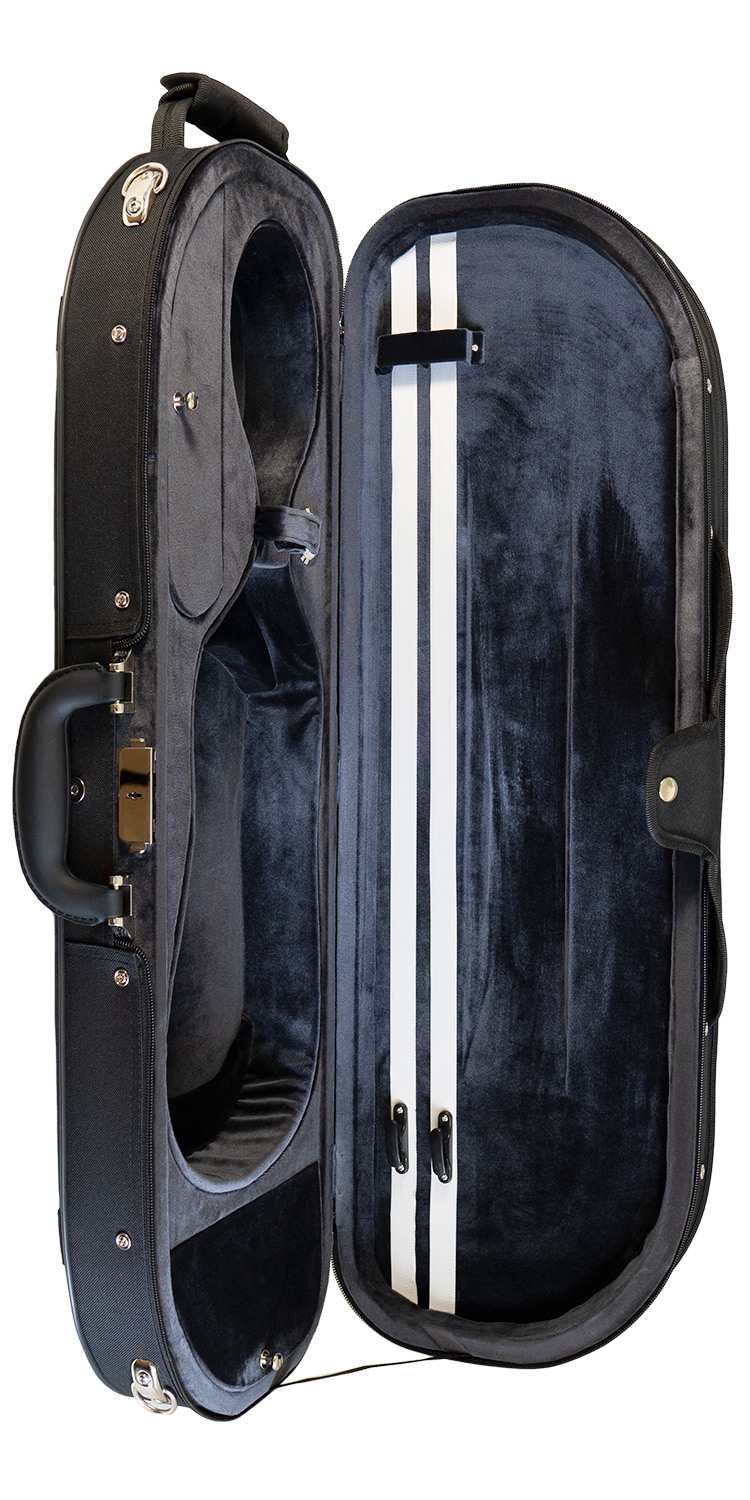 Profesionalen kovček za violino z lesenim jedrom, premium prevleko in zadrgami. Žametna notranjost s prostorom za 2 loka, note, mostiček, strune in kolofonijo.